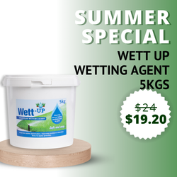 A: Hydrophobic soil is common in Australian heat. Using a wetting agent maximises your water efficiency and ensures irrigation will reach the roots. Wett-Up Soil Wetting Agent 5 kg on special this month.