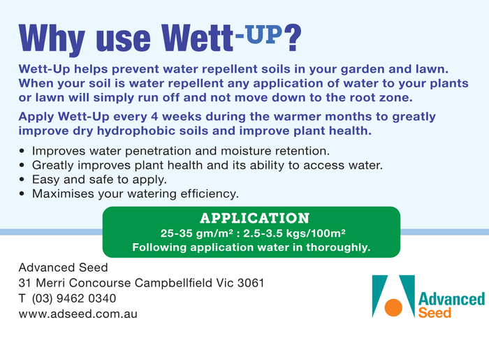 Wett-Up Granular Wetting Agent is a specialised non-ionic surfactant designed for use on lawns, garden beds, in pots and on all professional turf areas.